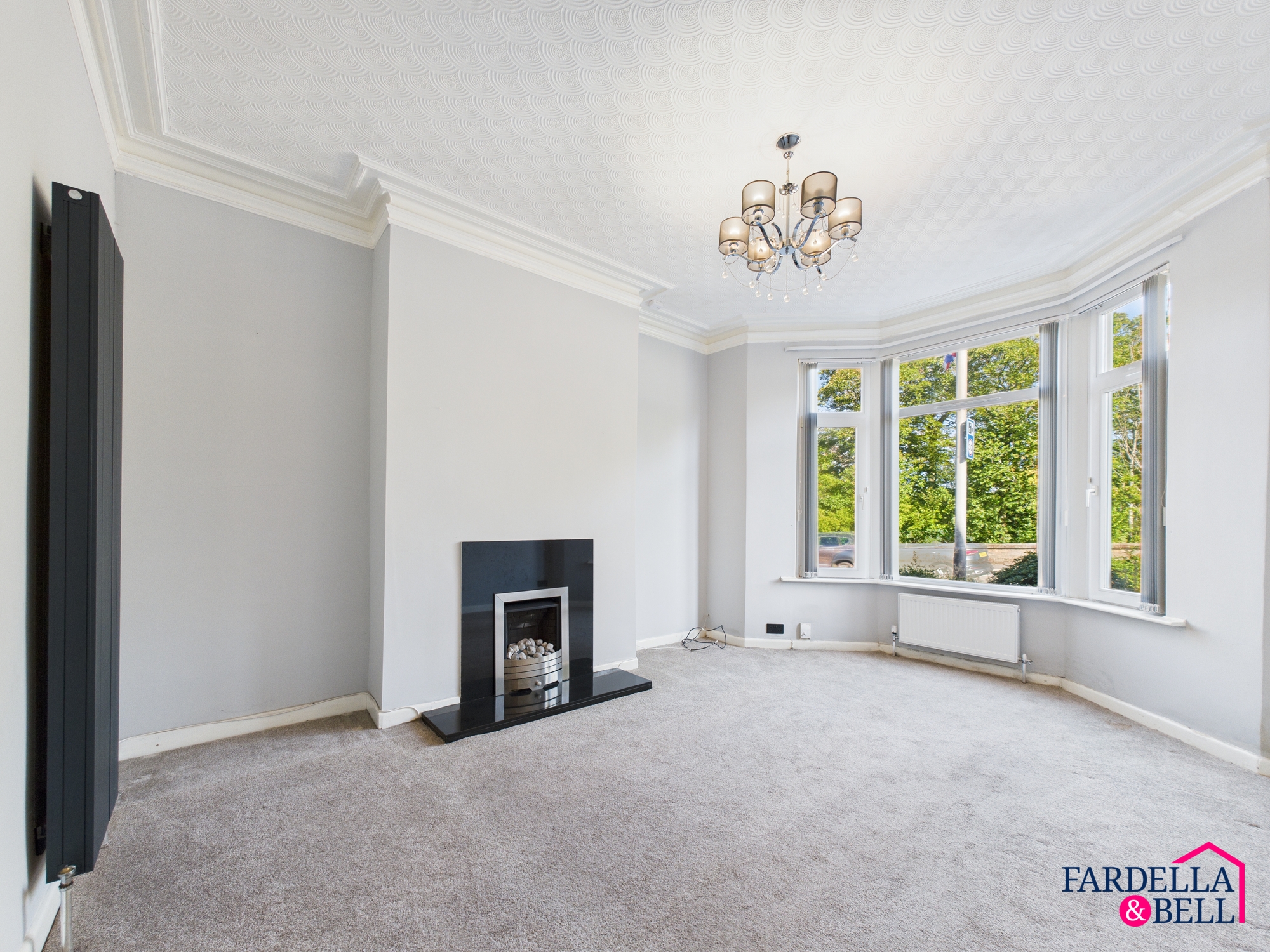 A beautifully appointed living room offering a harmonious blend of space and style. This bright and airy space is enhanced by expansive UPVC bay windows that flood the room with natural light, creating a warm and inviting ambiance and an impressive anthracite radiator provides a modern touch. Elegant ceiling detailing adds refined character. A contemporary fireplace with a sleek black surround anchors the room with modern charm. Finished with soft, neutral-toned carpeting, this room offers a versatile canvas ready to complement any interior style.