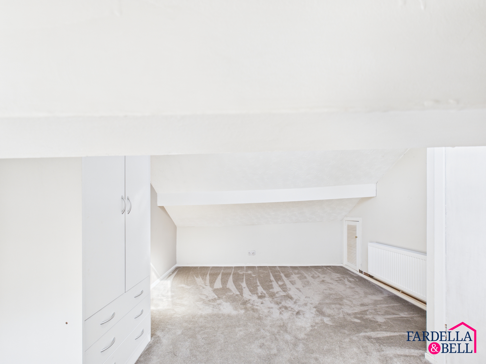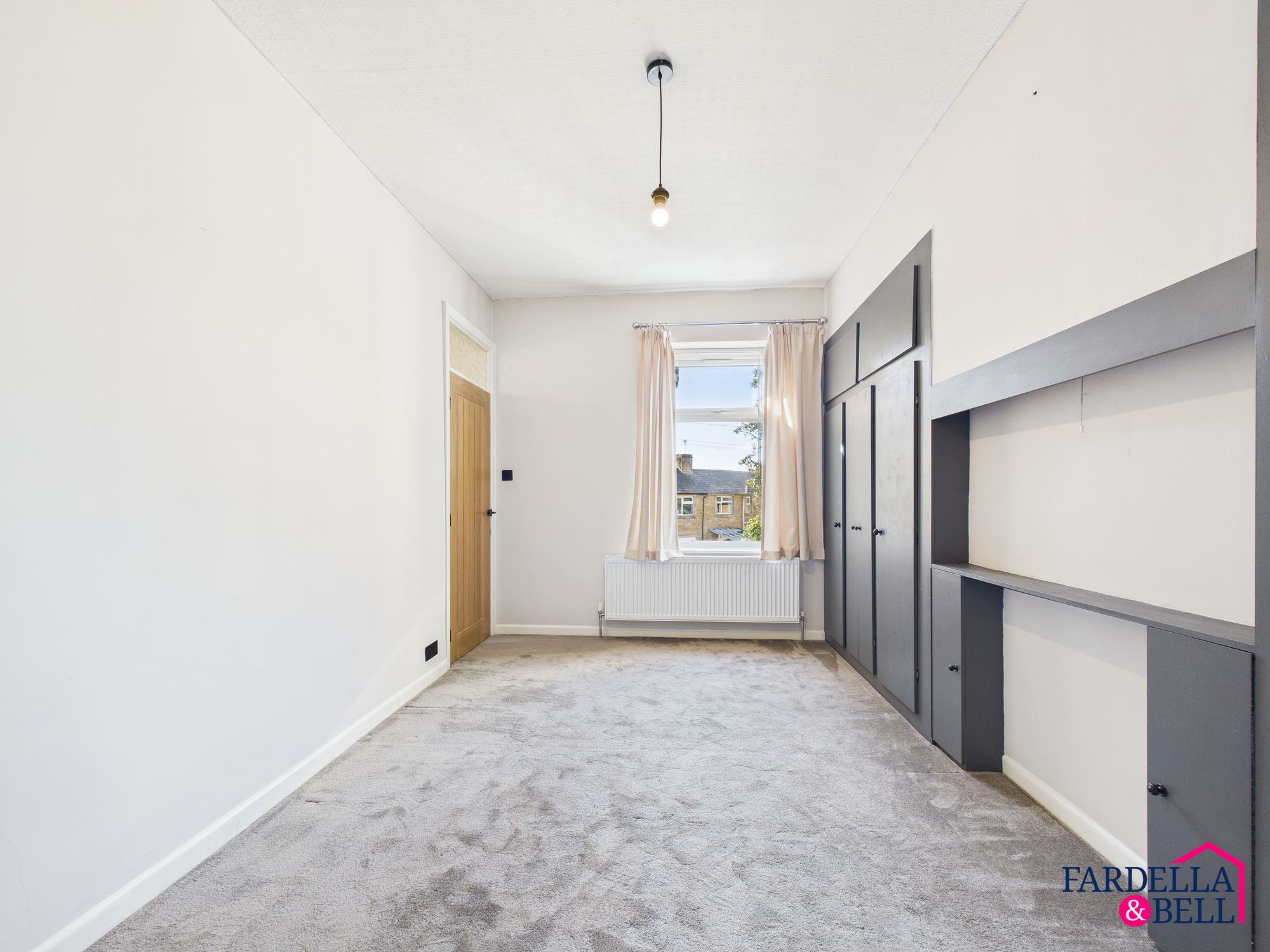 A versatile and well-presented space offering versatile space. The room benefits from neutral décor and soft grey carpeting, creating a calm and adaptable environment. A large UPVC window allows natural light to fill the space, complemented by a neatly positioned radiator below. Built-in dark grey wardrobes and shelving provide practical storage solutions while maintaining a sleek, modern look. The room is completed with a wooden door and a minimalist ceiling light fitting, enhancing its clean and functional aesthetic.