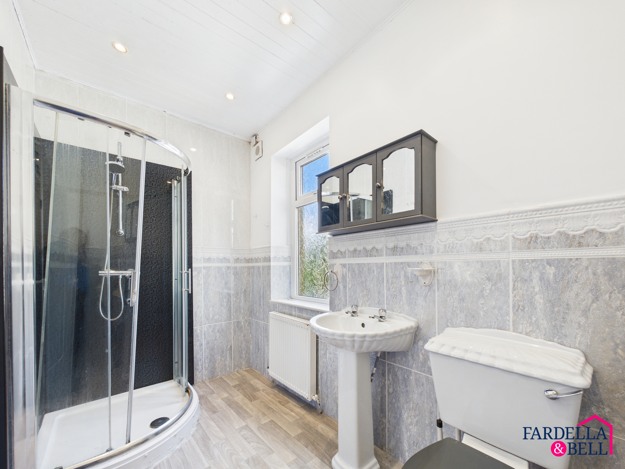 A well-appointed bathroom combining modern finishes with practical design. The space features a corner shower unit with a curved glass enclosure, set against stylish grey half-height tiling and crisp white walls. A large UPVC window allows natural light to brighten the room, complemented by recessed ceiling lighting for a clean, contemporary feel. The layout includes a pedestal sink and a neatly positioned toilet. The neutral-toned flooring completes the fresh and functional aesthetic.