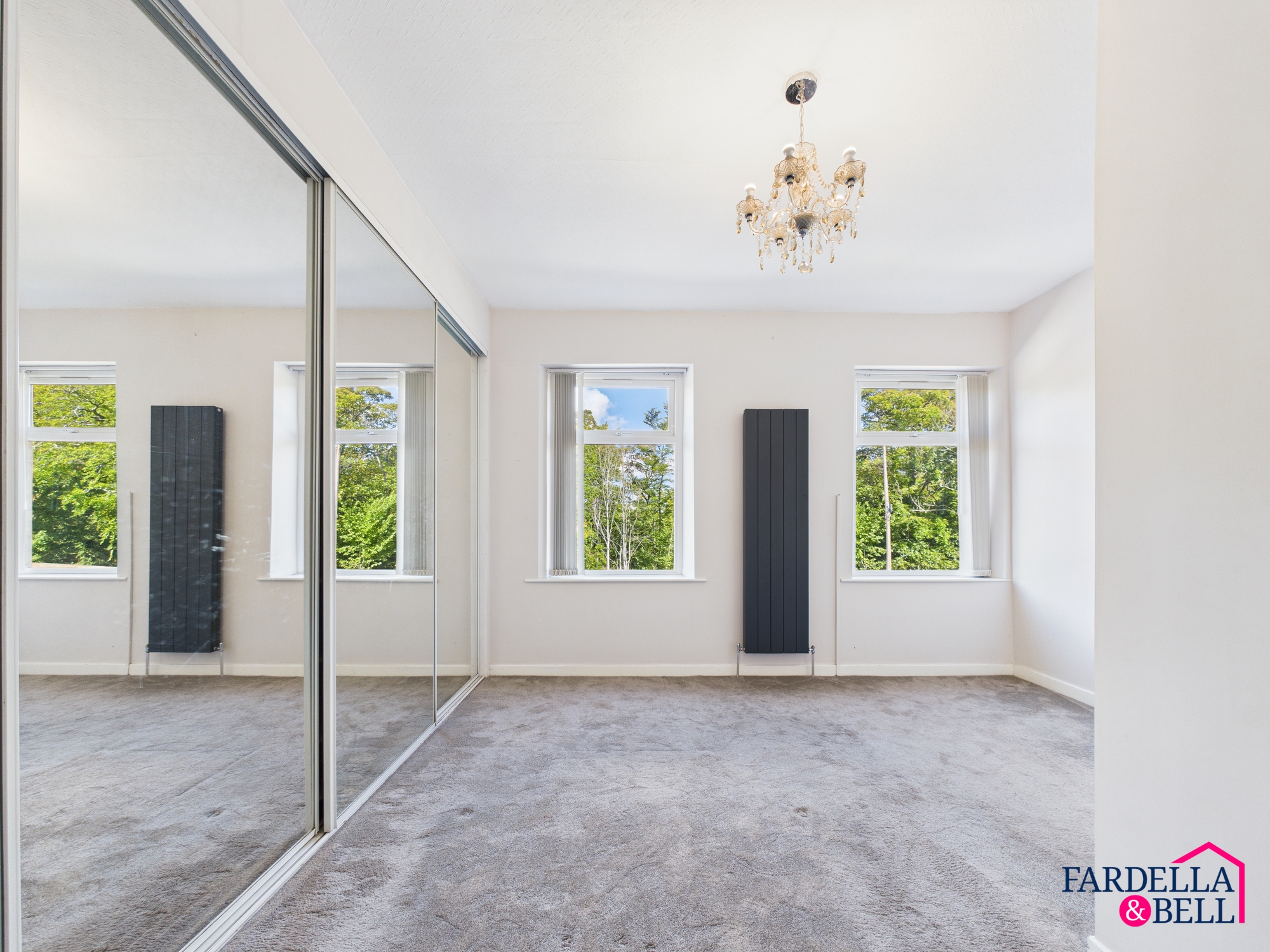 A generously sized bedroom offering an abundance of natural light and a refined finish. This bright and airy space is enhanced by two large windows that frame leafy views and flood the room with daylight. The soft grey carpeting and neutral wall tones create a calming atmosphere, while the vertical radiators provide efficient heating without compromising on style. A full-width mirrored sliding wardrobe not only offers excellent storage but also amplifies the sense of space and light throughout the room.