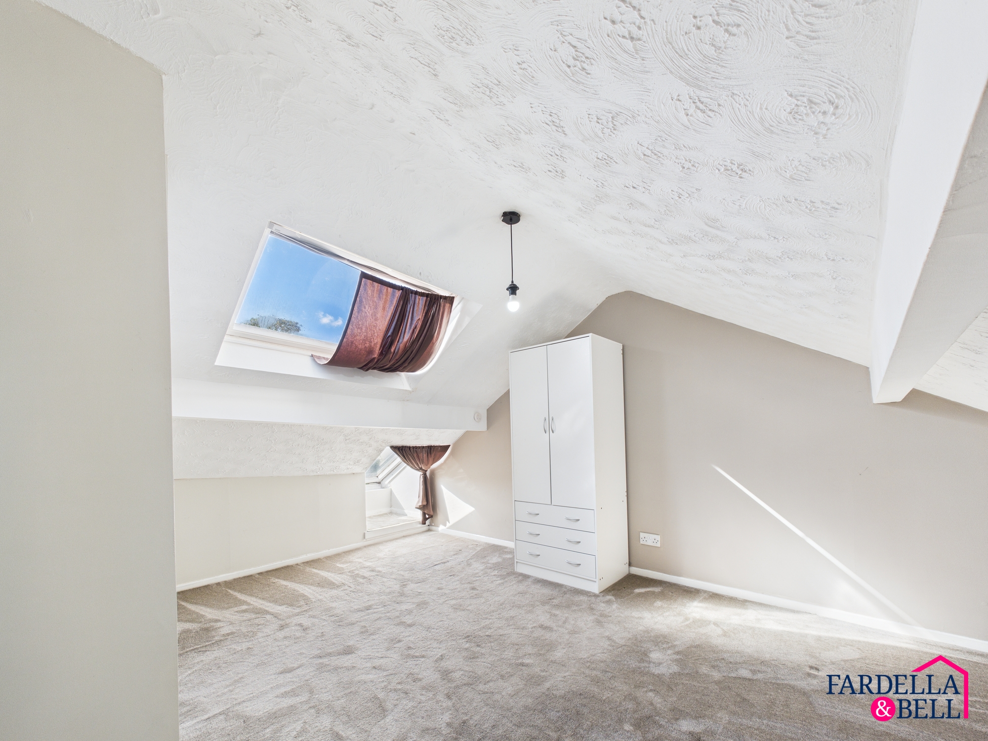 A charming attic room offering a unique and light-filled retreat. Featuring a sloped ceiling with velux window, this space is bathed in natural light throughout the day. The neutral wall tones and soft grey carpeting create a calm and inviting atmosphere, while the overhead light fixture ensures practicality during evening hours. Its clean lines and well-maintained finish make it ideal for use as a bedroom, studio, or quiet workspace.