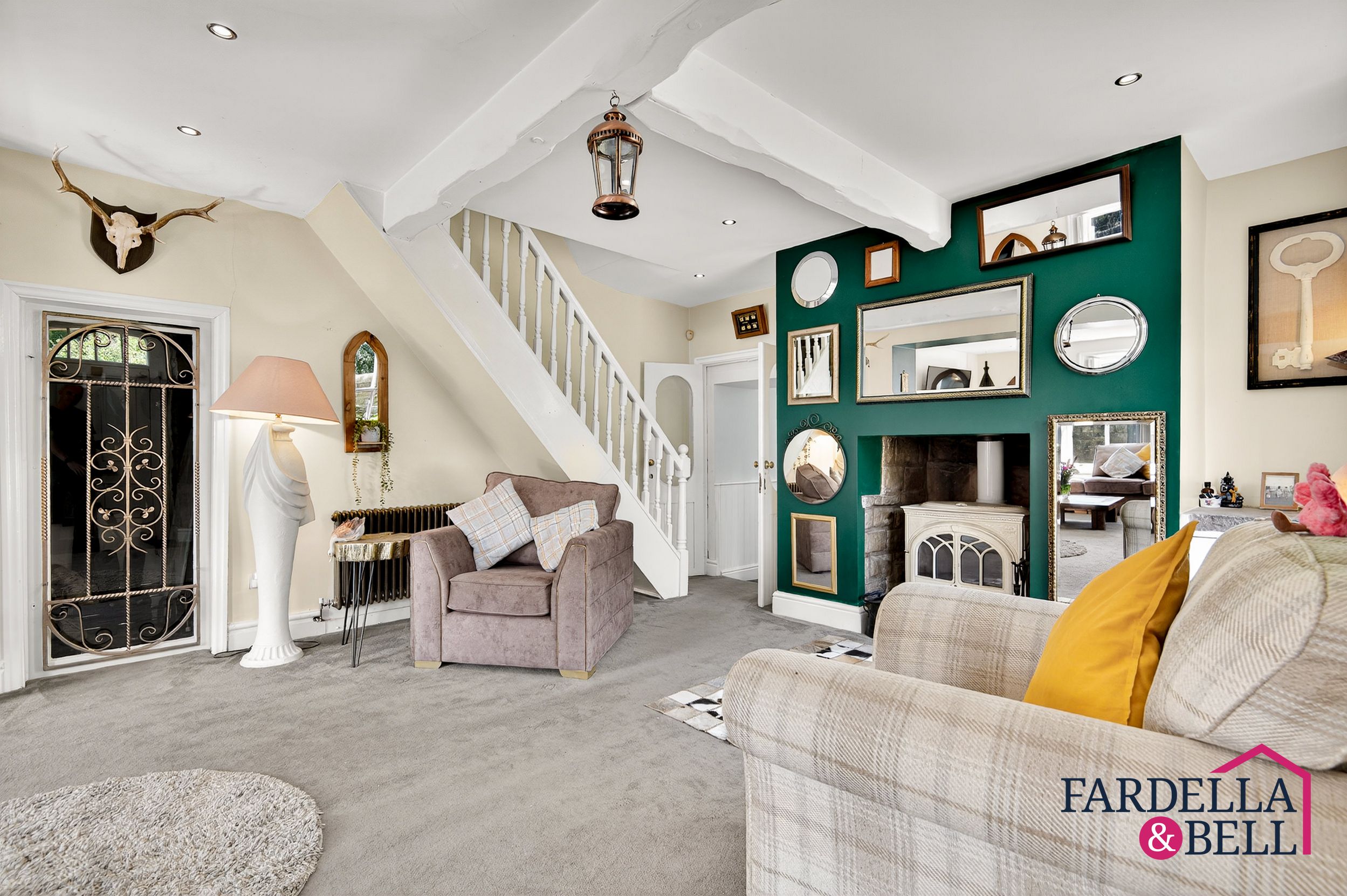 Exposed stone walls to the front elevation, spotlights to the ceiling, fitted carpet, multi fuel stove set within chimney breast, TV point, open beams, double glazed sash windows, two radiators and open balustrade staircase leading to the first floor.