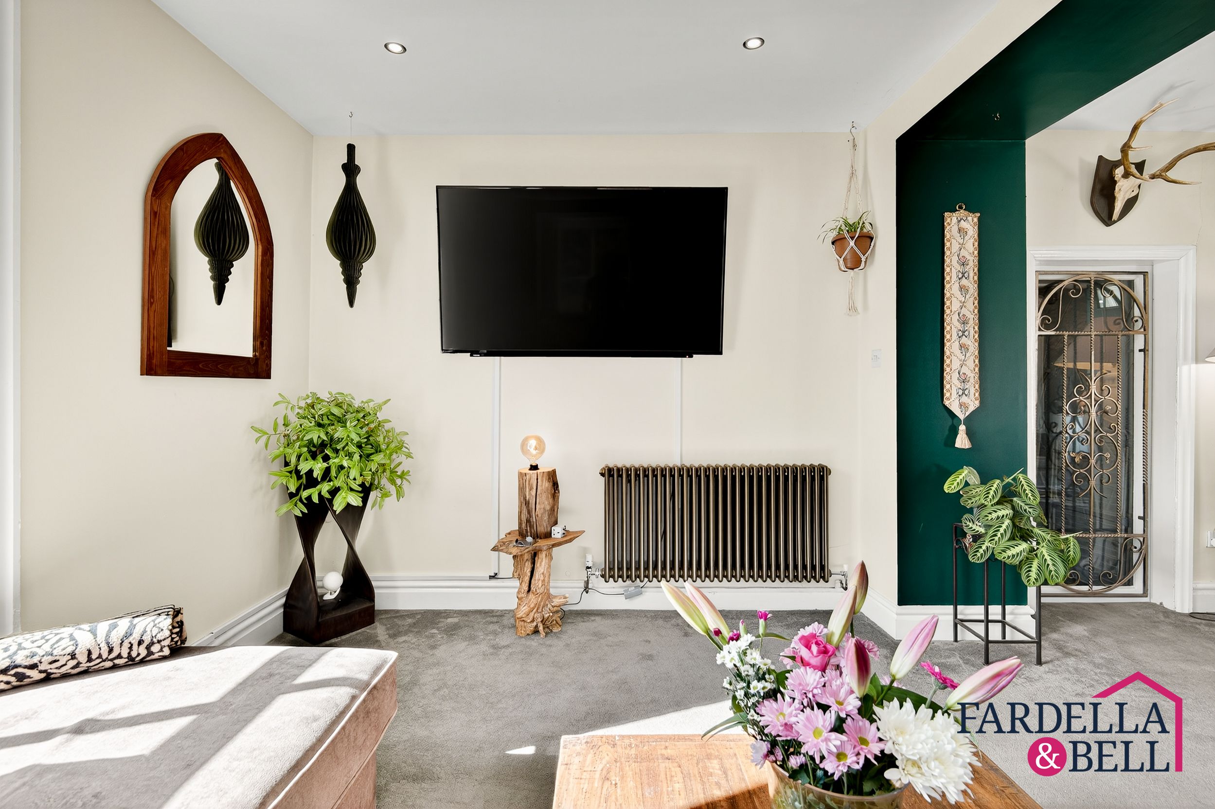 Spotlights to ceiling, double glazed sash windows, wooden side door leading to the rear garden, radiator, space for dining table and bench seating and skylight allowing plenty of natural light to come in.