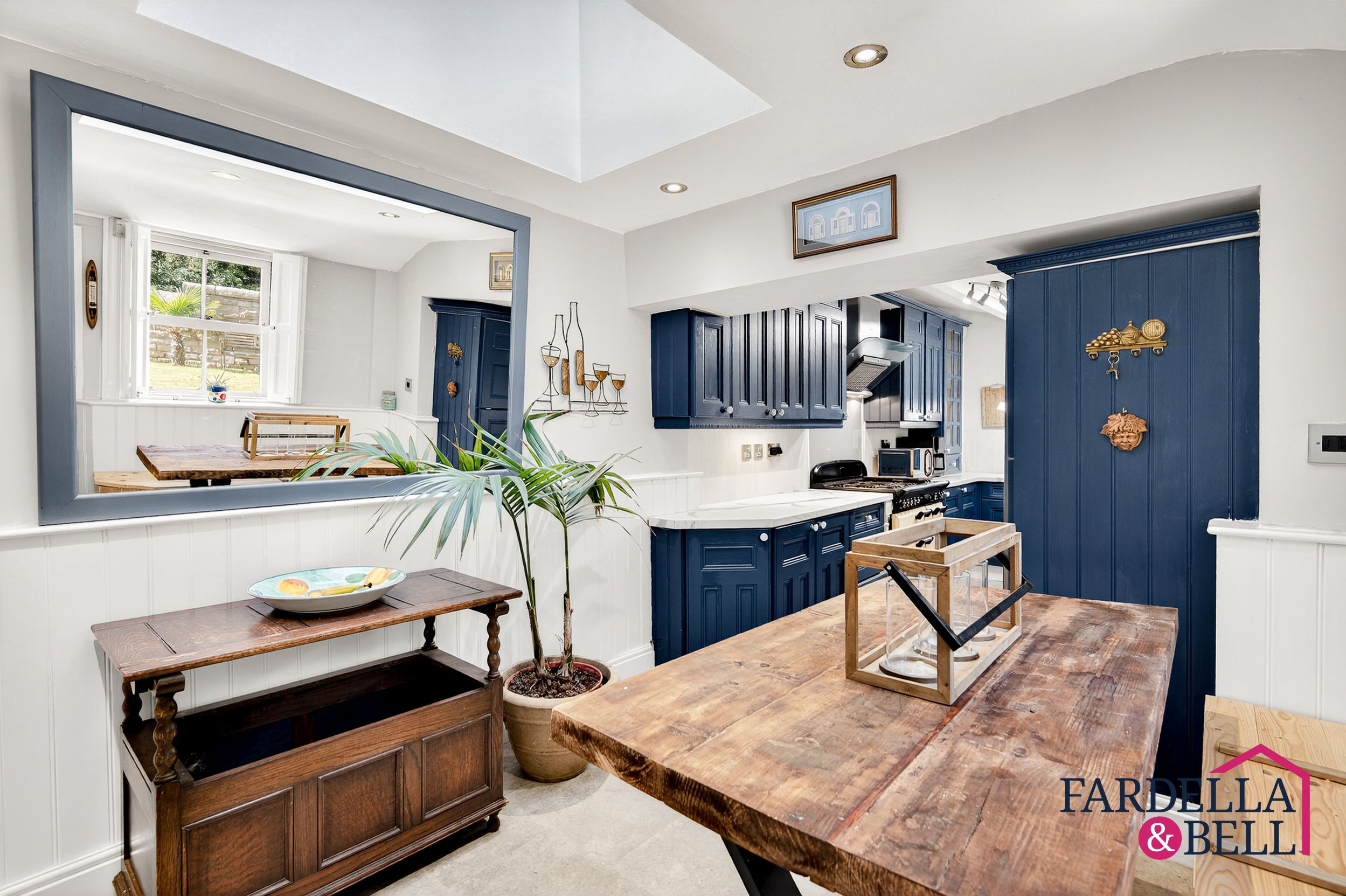Inside, the stylish open plan reception area features a cosy wood-burning stove set against an exposed stone wall, seamlessly connecting the living and dining spaces. The modern kitchen is a culinary delight, complete with elegant blue cabinetry, integrated appliances, marble countertops, and a skylight that floods the space with natural light. Both bathrooms feature contemporary fixtures. Ample built-in storage and wardrobes are found throughout, providing both practicality and style. This remarkable cottage offers the perfect blend of rural serenity, period character, and modern luxury, making it an exceptional choice for discerning buyers.