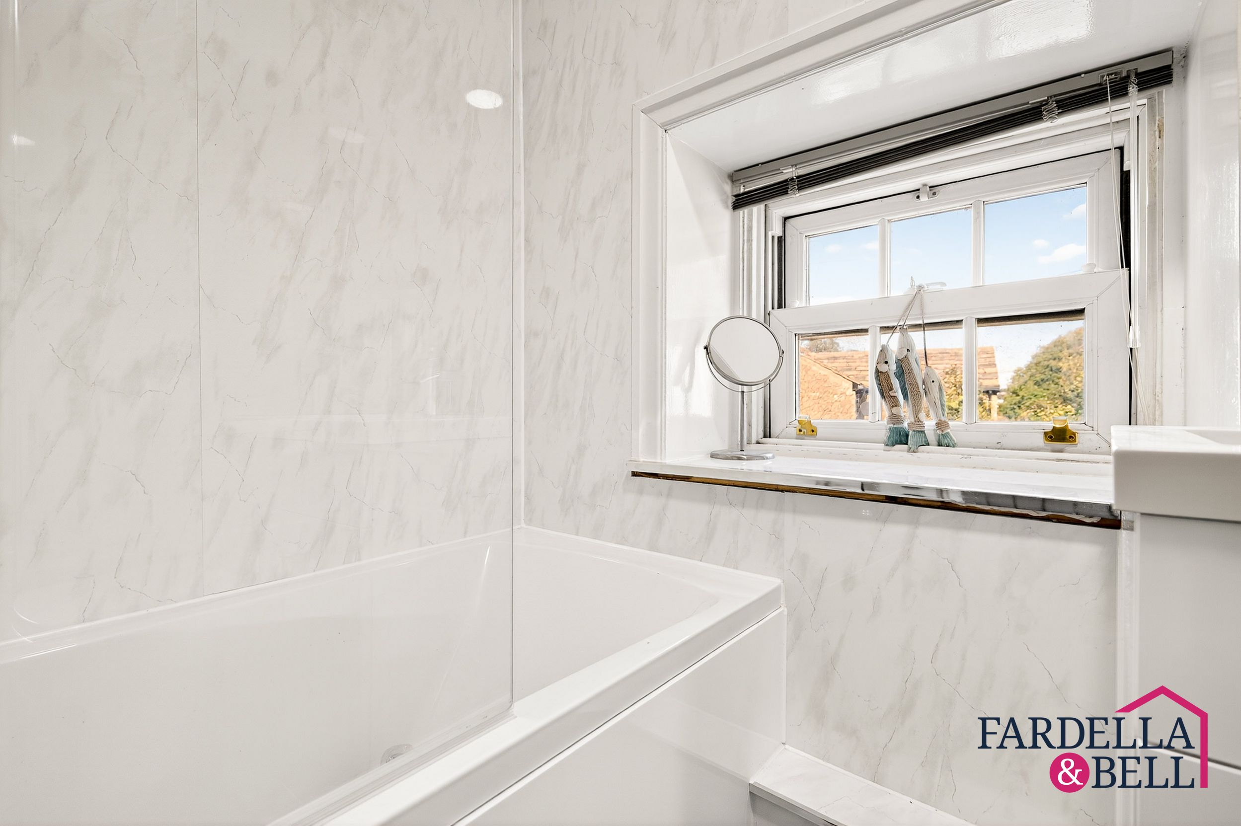 Panelled bath with overhead shower, wall mounted radiator, vanity unit with sink and push button WC, wet wall panelling, double glazed sash window, illuminated mirror and ceiling light point.