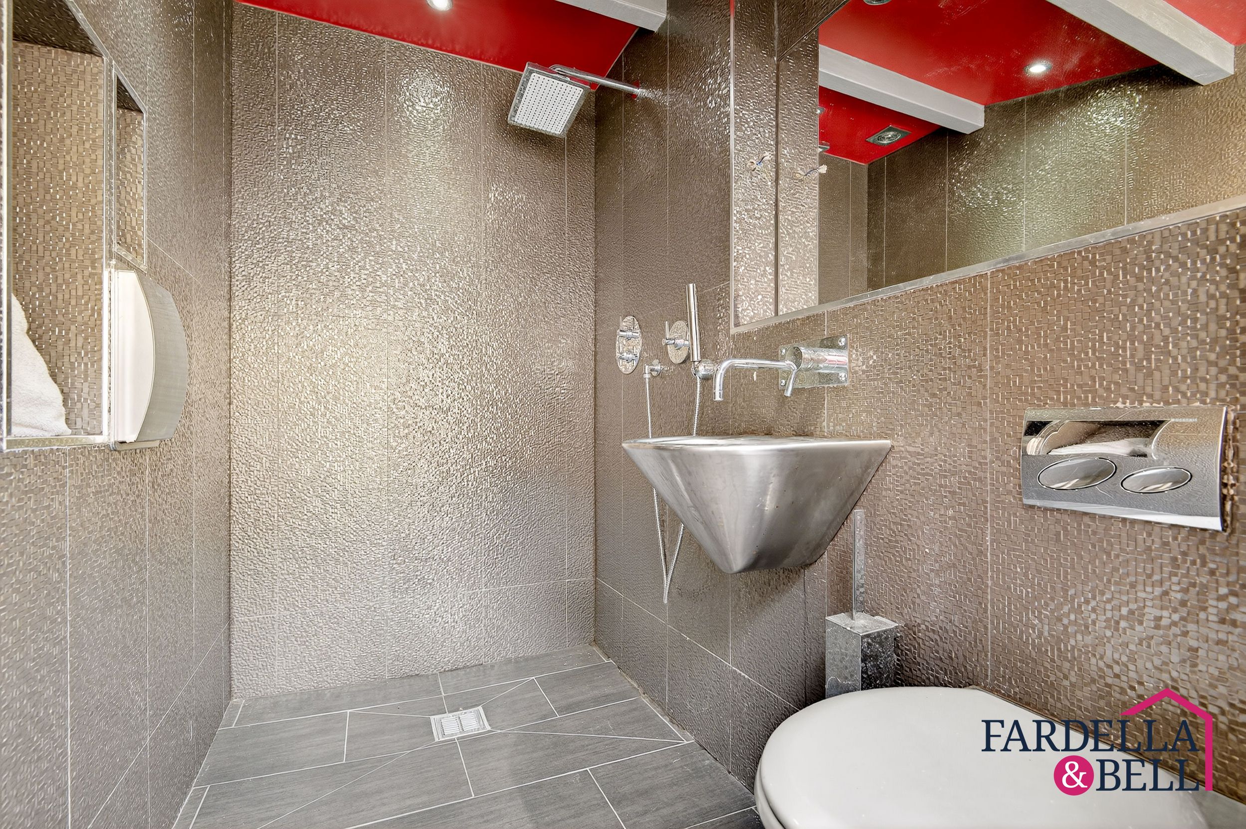 Partially panelled walls, shower enclosure with mains fed shower, spotlights, vanity unit with sink and mixer tap, push button WC and modern wall mounted radiator.